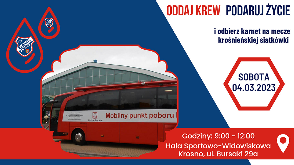 Każdy, kto zgłosi chęć donacji w tym dniu, otrzyma darmowy karnet upoważniający do wstępu na mecze ligowe siatkówki w Krośnie w sezonie 2023/2024: