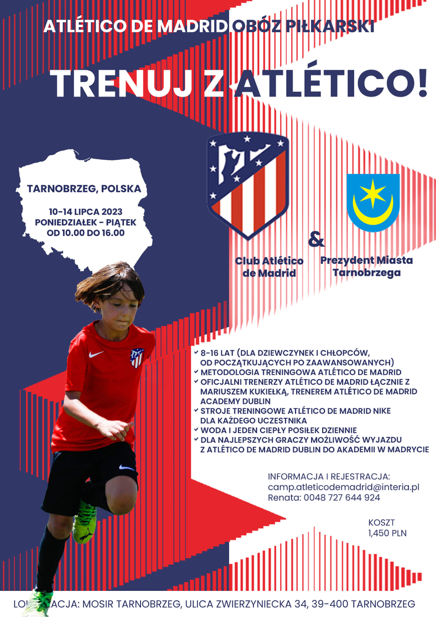 - Serdecznie zapraszamy na niepowtarzalny, pierwszy taki camp piłkarski organizowany w Polsce przez hiszpański Klub Atletico de Madrid - czytamy na stronie organizatora. Obóz piłkarski odbędzie się w dniach 10-14 lipca 2023 roku na stadionie MOSiR-u Tarnobrzeg przy ul. Zwierzynieckiej.