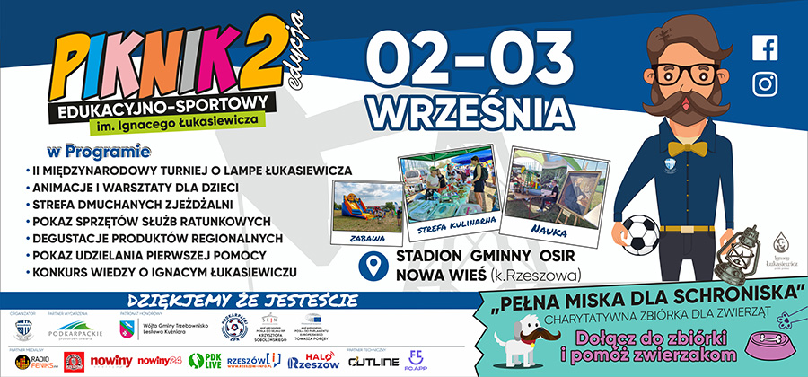 Piknik Edukacyjno-Sportowy im. Ignacego Łukasiewicza, bo właśnie tak brzmi oficjalna nazwa tego eventu, odbędzie się w dniach 2/3 września przy boisku gminnym OSiR w Nowej Wsi koło Rzeszowa. Nasza redakcja objęła to wydarzenia patronatem medialnym.