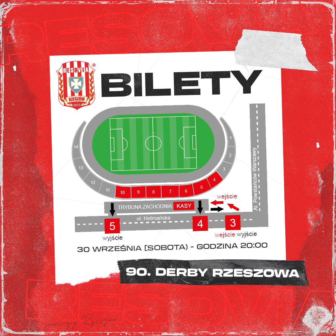 - UWAGA Sprzedaż biletów odbywa się tylko w wyżej wymienione dni. Dystrybucja biletów na derby NIE BĘDZIE prowadzona w weekendy oraz w dniu meczu z Polonią Warszawa. PŁATNOŚĆ zarówno gotówką jak i kartą. Przy zakupie wymagane jest podanie IMIENIA, NAZWISKA oraz NUMERU PESEL. Karnety wydane przez CWKS Resovia Rzeszów S.A. nie obowiązują na ten mecz- czytamy w dalszej części komunikatu na stronie Resovii.