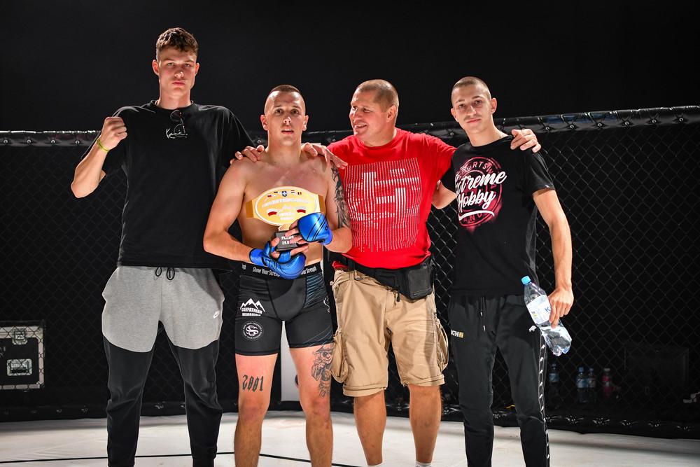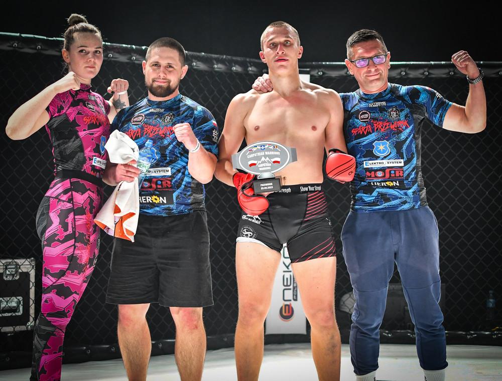 - Podczas gali Carpathian Warriors XII w Przeworsku odbyło się dziewięć pojedynków MMA i jeden w formule K1. Na zdjęciu Jakub Chorąży, po prawej trener Mirosław Okniński oraz Piotr Lizakowski / fot. Anna Schiffer