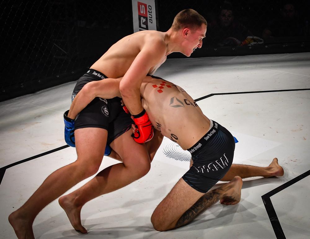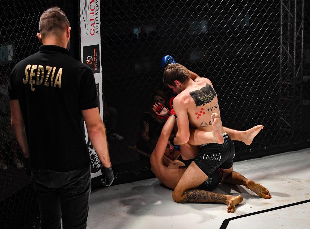 - Podczas gali Carpathian Warriors XII w Przeworsku odbyło się dziewięć pojedynków MMA i jeden w formule K1. Na zdjęciu Michał Kocur i Jakub Chorąży / fot. Anna Schiffer