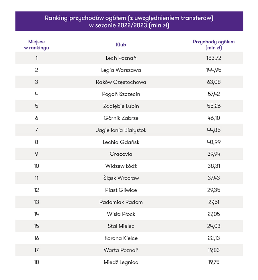 Największym przychodem ogółniem w sezonie 2022/2023 może pochwalić się Lech Poznań. "Kolejorz" wypracował ponad 183 miliony złotych przychodu i wyprzedził Legię Warszawa (niecałe 145 mln zł).