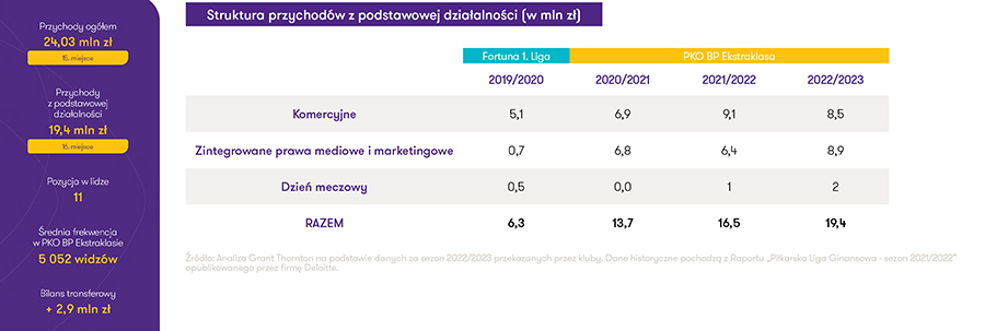 - Najważniejszymi przychodami w klubie były zintegorwane prawa mediowe i marketingowe oraz przychody komercyjne, które stanowiły 90% przychodów z podstawowej działalności w klubie. Pierwsze wzrosły o 2,5 mln zł w sezonie 2022/2023 i stały się głównym źródłem przychodów. Aż 8,7 mln zł z tej kwoty stanowiły wpływy z transmisji, natomiast 0,2 mln zł pochodziło z nagród od PZPN.