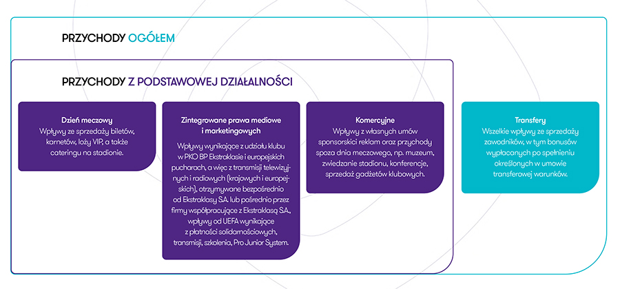 Przychody z podstawowej działalności - czyli przychody z dnia meczowego oraz zintegrowane prawa mediowe i marketingowe oraz wpływy komercyjne. Do tego dochodzą wpływy z transferów, co łącznie daje nam przychód ogółem. Całą zależność doskonale wyjaśnia poniższa inforgrafika.