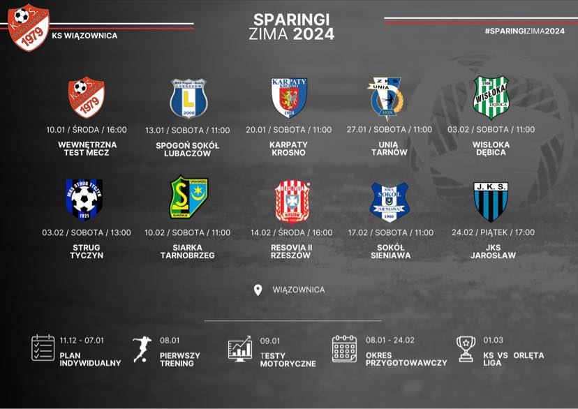 KS Wiązownica przygotowania do nadchodzącej rundy wiosennej rozpocznie 8 stycznia. Łącznie trzecioligowiec ma w planie 9 meczów sparingowych.
