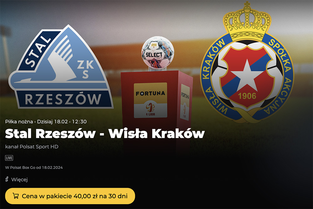 Transmisja na żywo z pojedynku Stali Rzeszów z Wisłą Kraków będzie dostępna także online w Polsat Box Go. Żeby ją obejrzeć musicie wykupić miesięczny dostęp za 40 zł. Dzięki temu jednak będziecie mogli oglądać wszystkie inne mecze Fortuna 1. Ligi przez 30 dni.