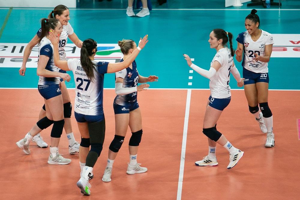 PGE Rysice Rzeszów: Katarzyna Wenerska, Ann Kalandadze, Magdalena Jurczyk, Gabriela Orvosova, Amanda Coneo, Weronika Centka, Aleksandra Szczygłowska (L) oraz Gabriela Makarowska-Kulej, Wiktoria Kowalska, Anna Obiała, Weronika Szlagowska.