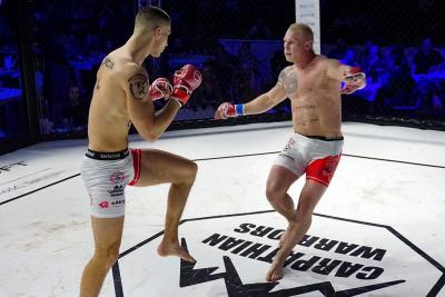 Podczas gali MMA Hegemon I w Sanok w oktagonie zobaczymy m.in. Łukasza Bieniasza (z lewej) oraz Kamila Rościńskiego, którzy mieli okazję zmierzyć się podczas Carpathian Warriors XII w Przeworsku w formuke K-1 (fot. Anna Schiffer / Carpathian Warriors)