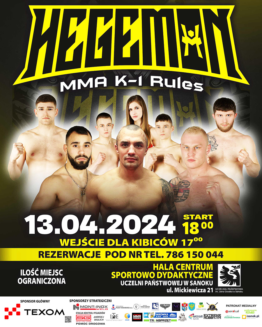 Pierwsza wala nowej organizacji sportów walki Hegemon odbędzie się już 13 kwietnia w Sanoku. Podczas eventu dojdzie do 12 pojdenków w formule MMA i K-1.
