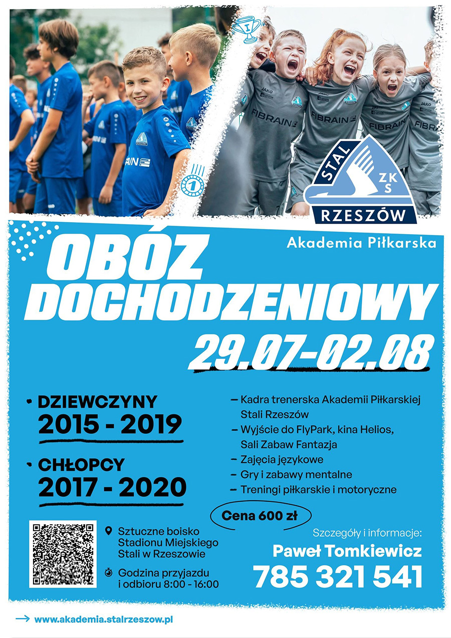 Akademia Piłkarska Stali Rzeszów w dniach 29 lipca - 2 sierpnia organizuje obóz dochodzeniowych. Udział mogą w nim wziąć chłopcy z roczników 2017-2020 i dziewczynki z roczników 2015-2019.