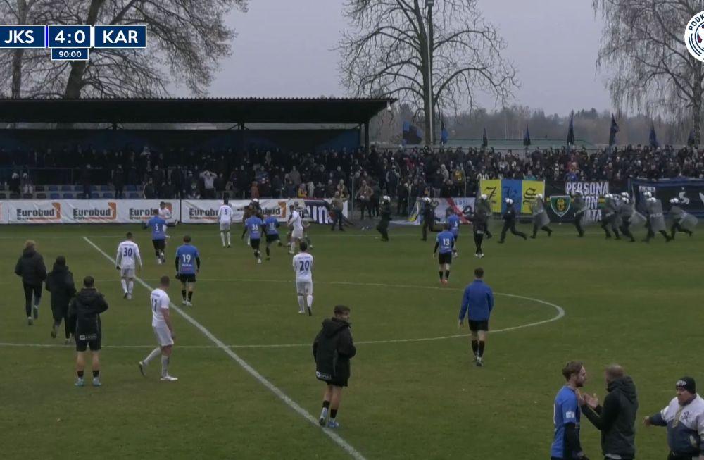 Po ostatnim gwizdku gorąco zrobiło się przy trybunie JKS-u Jarosław, pod którą znaleźli się piłkarze Karpat Krosno. Kibice wybiegli ze swojego sektora i zaczęli szarpać się z zawodnikami przyjezdnych. Na boisko wkroczyła policja...