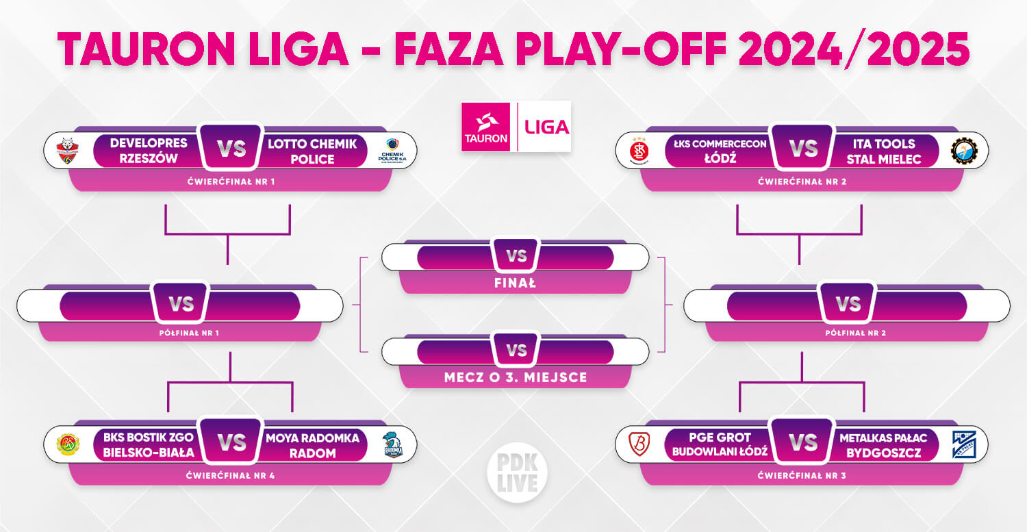 Oprócz pary KS DevelopRes Rzeszów (1) - LOTTO Chemik Police (8) dojdzie do pojedynków ŁKS Commercon Łódź (2) - ITA TOOLS Stal Mielec (7), PGE Grot Budowlani Łódź (3) - Metalkas Pałac Bydgoszcz (6) oraz BKS BOSTIK ZGO Bielsko-Biała (4) - MOYA Radomka Radom (5).