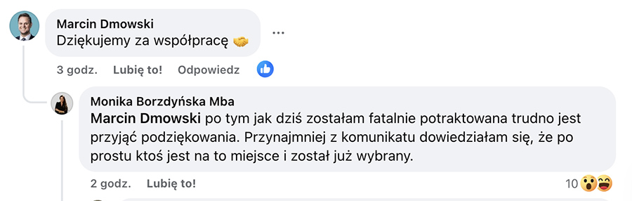 - Po tym jak dziś zostałam fatalnie potraktowana trudno jest przyjąć podziękowania. Przynajmniej z komunikatu dowiedziałam się, że po prostu ktoś jest na to miejsce i został już wybrany - odpisała mu Monika Borzdyńska.