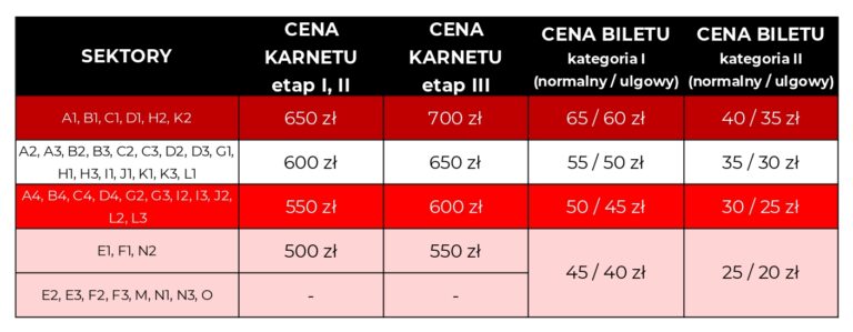 Ceny karnetów w pierwszym i drugim etapie rezerwacji w zależności od zajmowanego sektora wynoszą od 500 do 650 złotych. W przypadku ostatniej fazy są one o 50 złotych droższe.