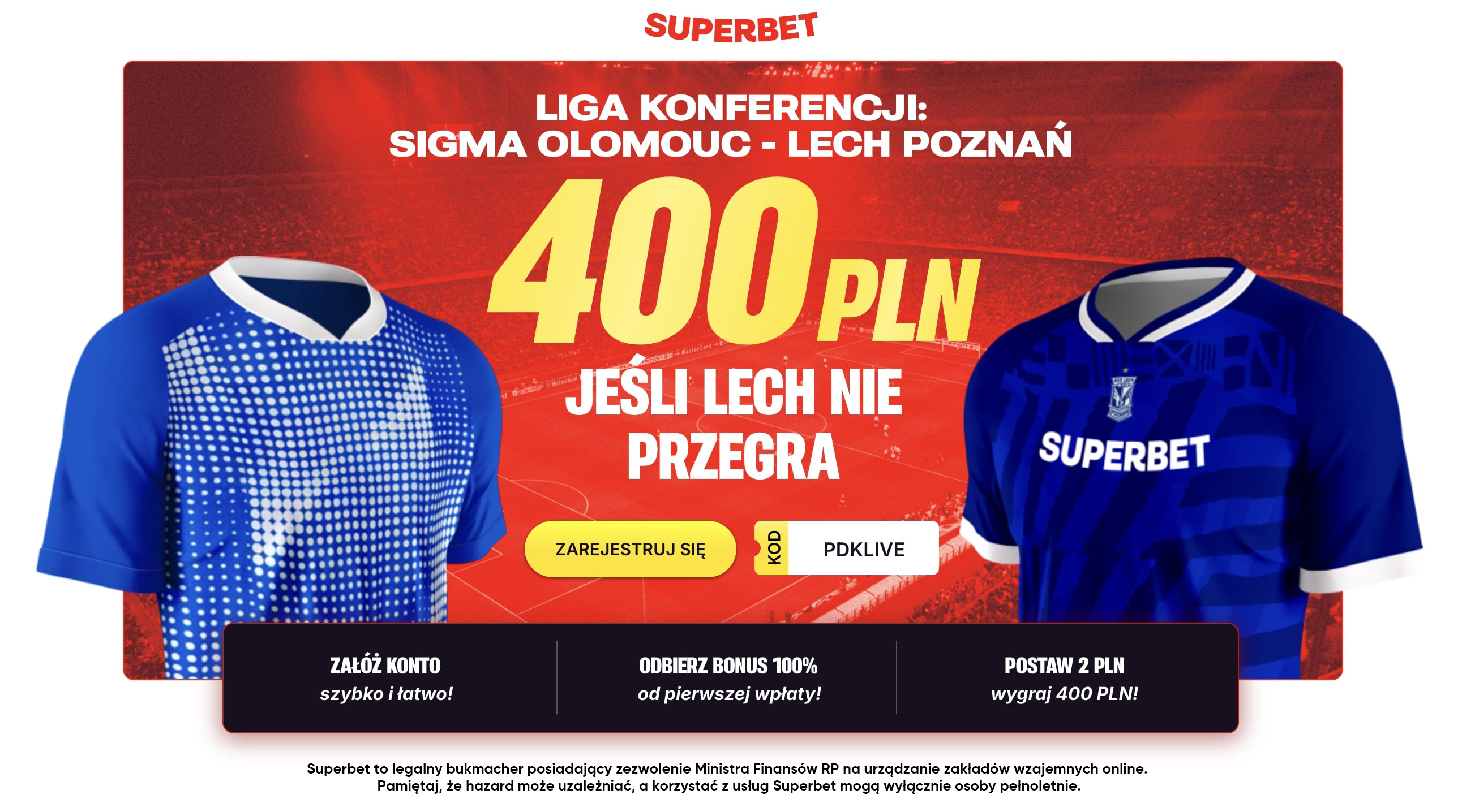 Co zrobić, by otrzymać bonus? To bardzo proste. Wystarczy, że załóżysz konto w Superbet z kodem PDKLIVE i postawisz pierwszy kupon (singiel) na to, że Lech Poznań nie przegra dziś w wyjazdowym meczu Ligi Konferencji z Sigmą Ołomuniec (x2). Jeśli Twój kupon będzie wygrany, otrzymasz dodatkowo ekstra bonus w wysokości 400 PLN.
