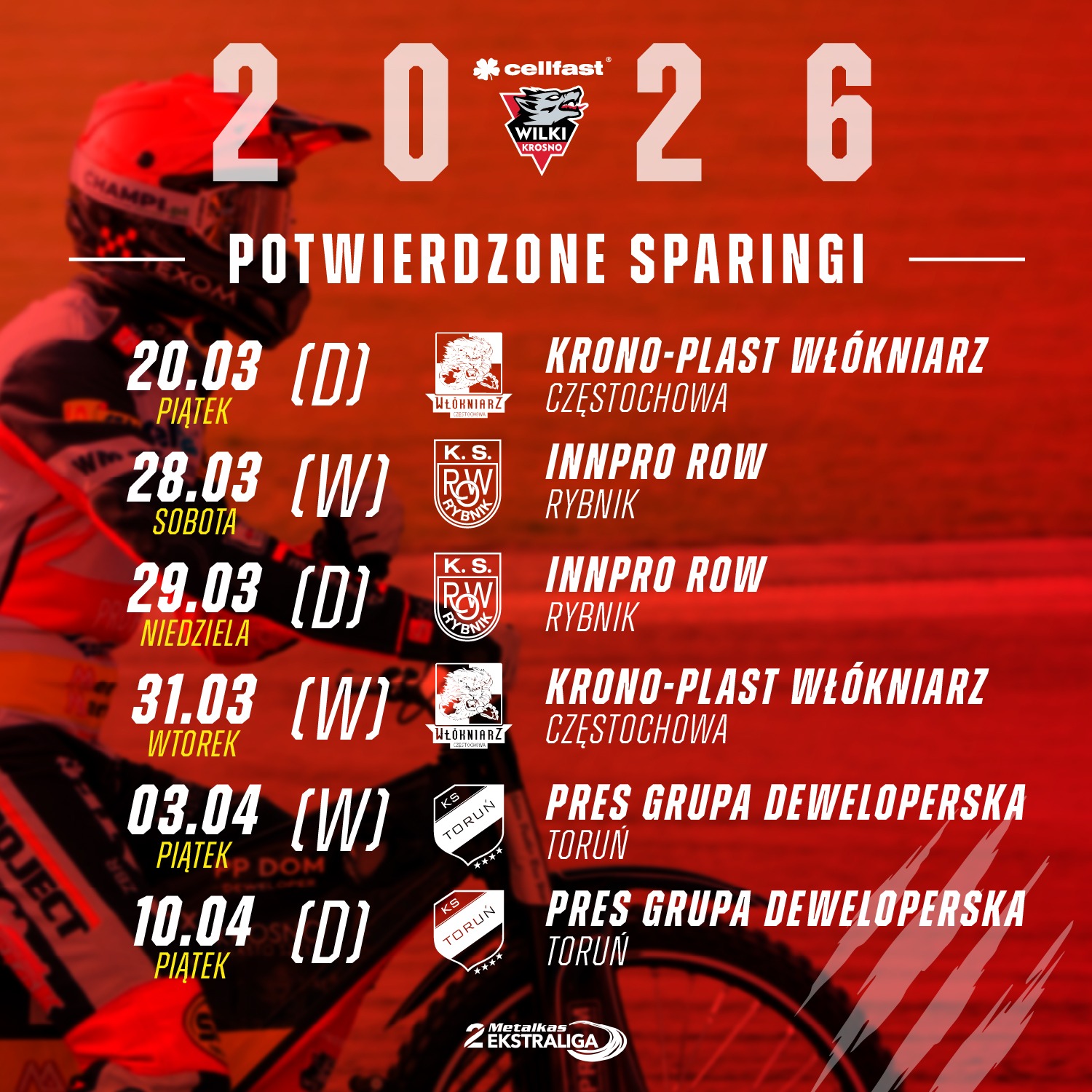Cellfast Wilki Krosno intensywnie przygotowują się do sezonu 2026. „Wataha” rozegra sześć meczów kontrolnych, w tym z aktualnym drużynowym mistrzem Polski oraz zespołami PGE Ekstraligi, co ma zapewnić mocne wejście w rozgrywki Metalkas 2. Ekstraligi.