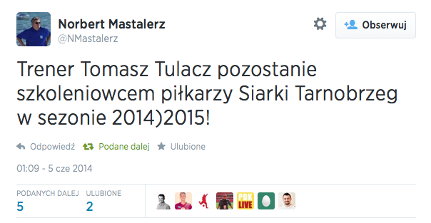 - Trener Tomasz Tułacz pozostanie szkoleniowcem piłkarzy Siarki Tarnobrzeg w sezonie 2014/2015 - poinformował Norbert Mastalerz.