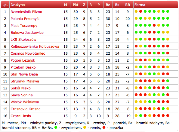 Czerwoną latarnią ligi są gracze Czarnych Jasło, którzy w 15 meczach zgromadzili zaledwie 9 punktów. Tylko szczebel wyżej jest Crasnovia, która zgromadziła 4 punkty więcej.