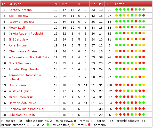 Absolutnym mistrzem jesieni i bezapelacyjnie najlepszą drużyną sezonu są jak na razie Karpaty Krosno. Podopieczni Szymona Szydełko w 19 meczach zdobyli 47 punktów i wypracowali sobie aż 8 punktów przewagi nad kolejnymi w tabeli drużynami z Rzeszowa i aż 13 nad czwartym Motorem Lublin.