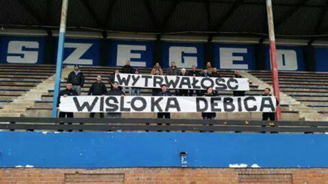 Wsparcie dla Biało-Zielonych napływa także z Węgier. Na zdjęciu poniżej widać fanów z zaprzyjaźnionego Szeged z transparentem "Wytrwałość. Wisłoka Dębica".