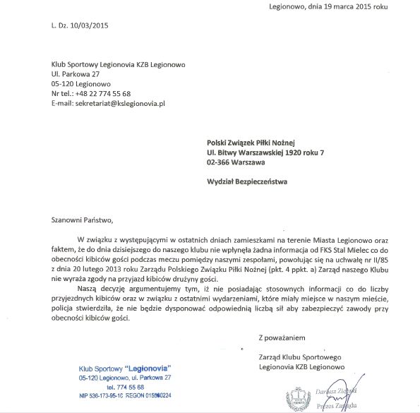 - W związku z występującym w ostatnich dniach zamieszkami na terenie miasta Legionowo oraz fakte, że do dnia dzisiejszego nie wpłynęła żadna informacja od FKS Stal Mielec, co do obecności kibiców gości (...) zarząd naszego klubu nie wyraża zgody na przyjazd kibiców drużyny gości - czytamy w komunikacie Legionovii.
