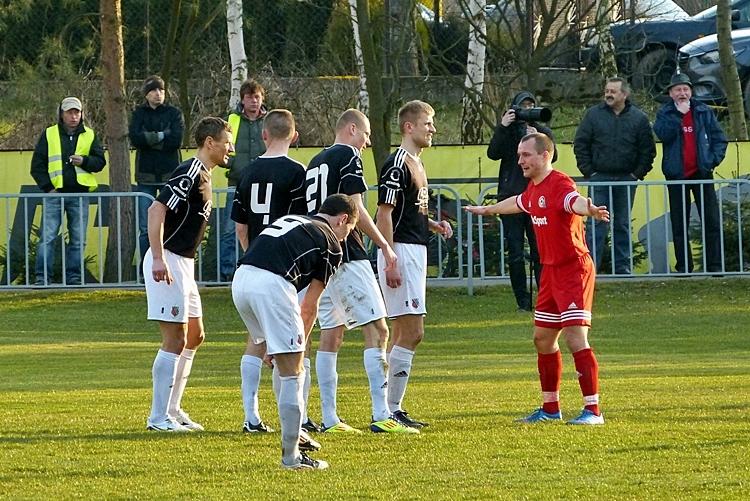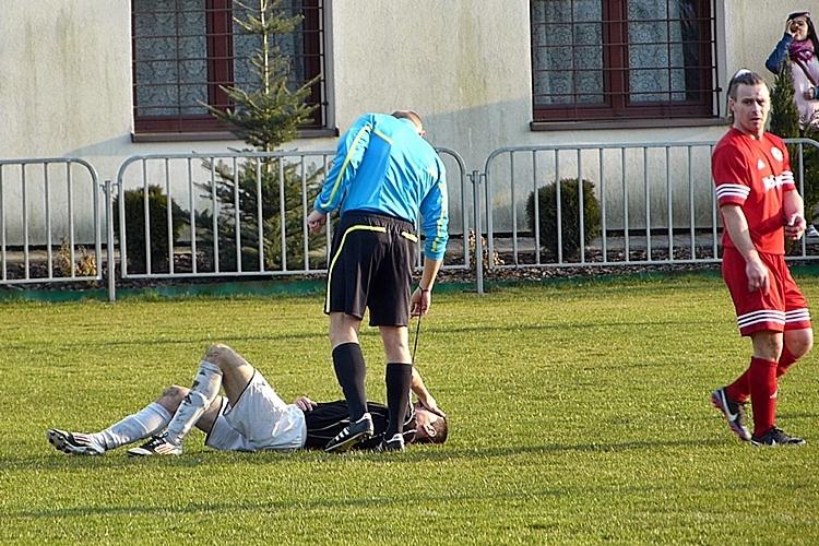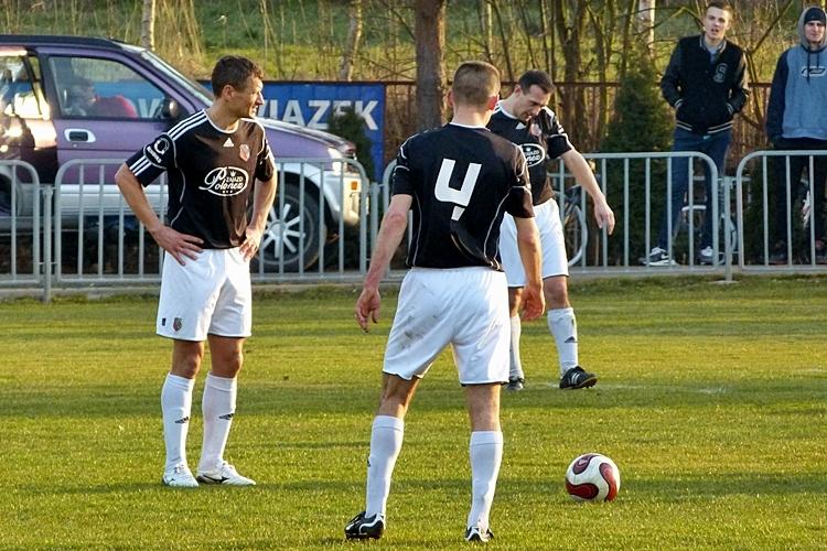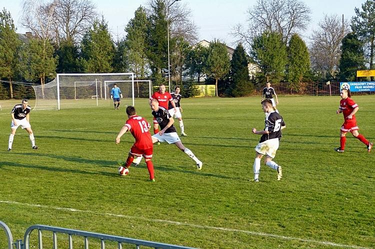 3/26 - Piast Tuczempy (czarno-białe stroje) zatrzymał piłkarzy Rzemieślnika Pilzno, którzy stracili pozycję lidera 4 ligi podkarpackiej (fot. Mieczysław Turczyn)
