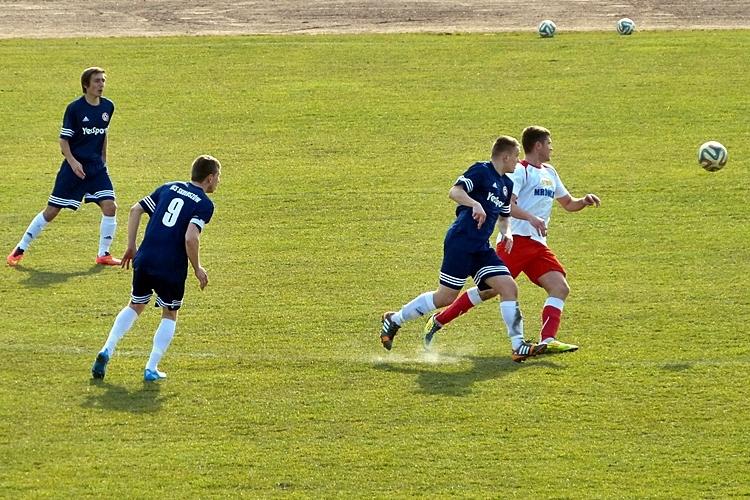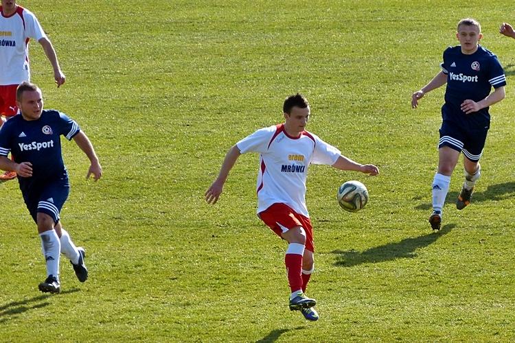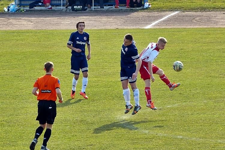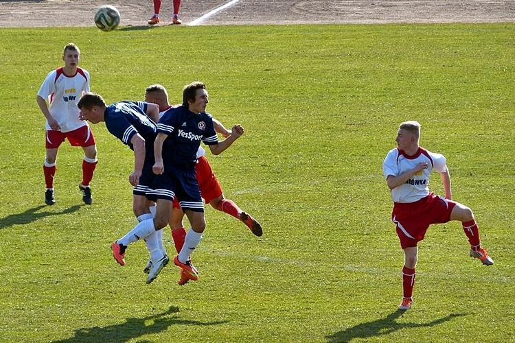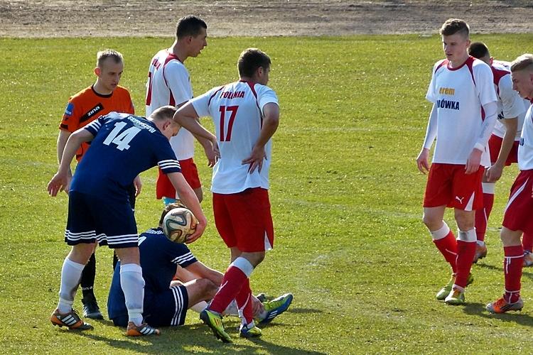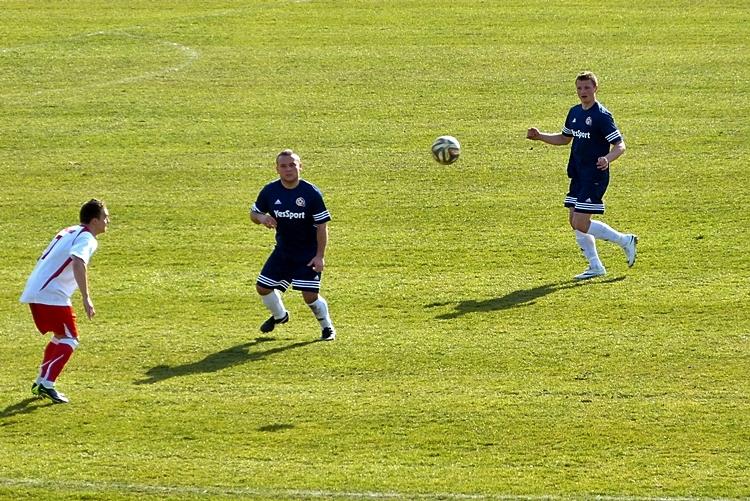 - Polonia Przemyśl (biało-czerwone stroje) wygrała 2-0 z LKS-em Skołoszów po golach Arkadiusza Gosy i Mateusza Wanata (fot. Mieczysław Turczyn)