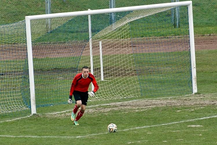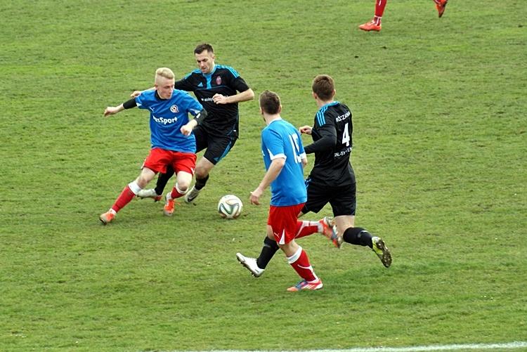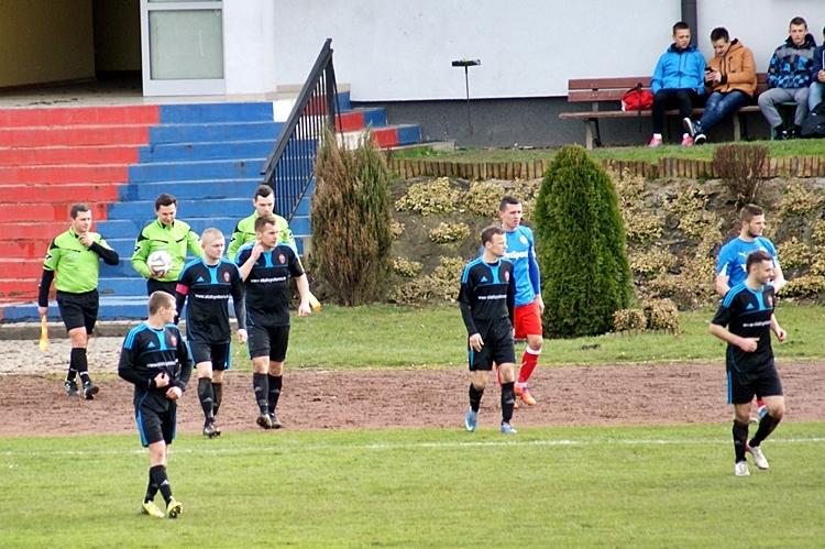 3/22 - Polonia Przemyśl (niebiesko-czerwone stroje) wygrała 2-1 z trzecioligową Wólczanką Wólka Pełkińska i awansowała do finału okręgowego Pucharu Polski (fot. Mieczysław Turczyn)