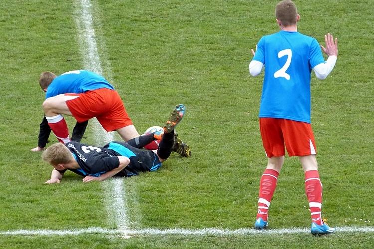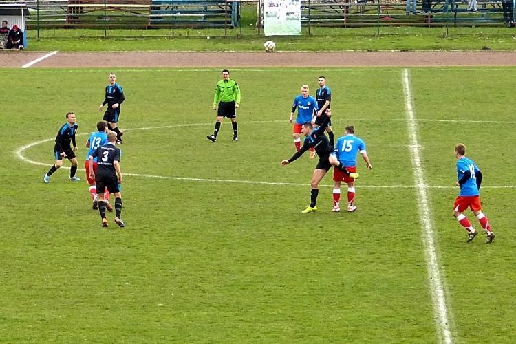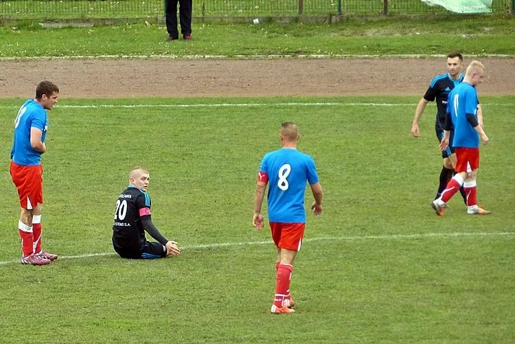 4/22 - Polonia Przemyśl (niebiesko-czerwone stroje) wygrała 2-1 z trzecioligową Wólczanką Wólka Pełkińska i awansowała do finału okręgowego Pucharu Polski (fot. Mieczysław Turczyn)