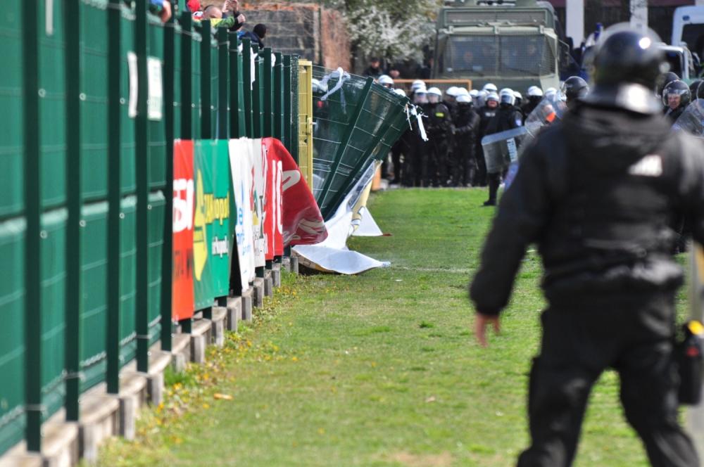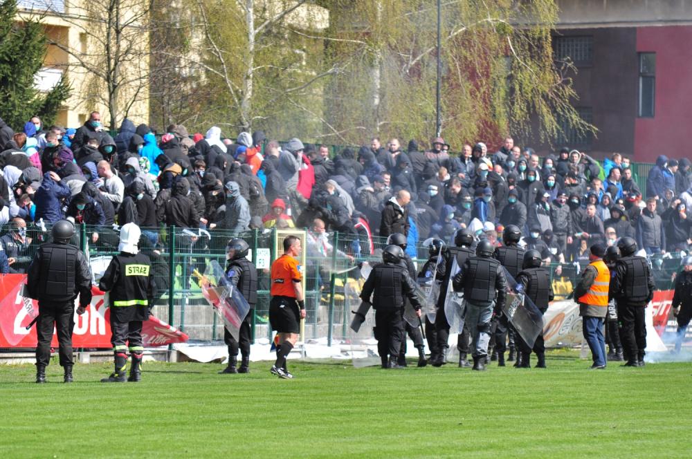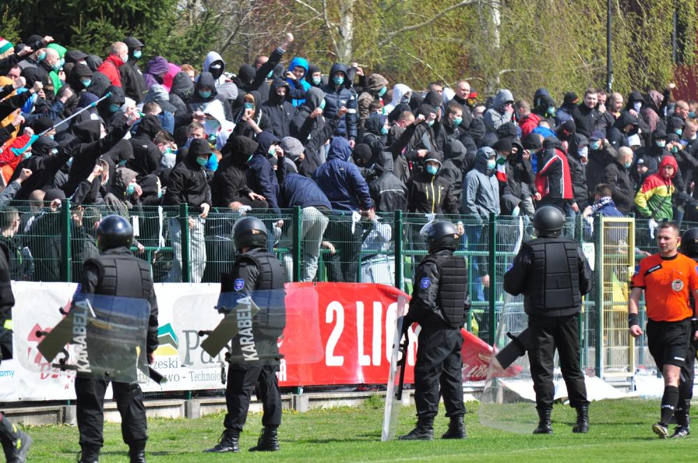 Zdjęcia z meczu Siarka Tarnobrzeg - Zagłębie Sosnowiec (1-2) w ramach 26. kolejki 2 ligi. Nerwowo było szczególnie w sektorze gości, którzy wyłamali ogrodzenie i spalili flagę Siarki.