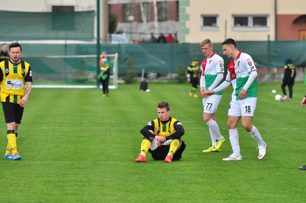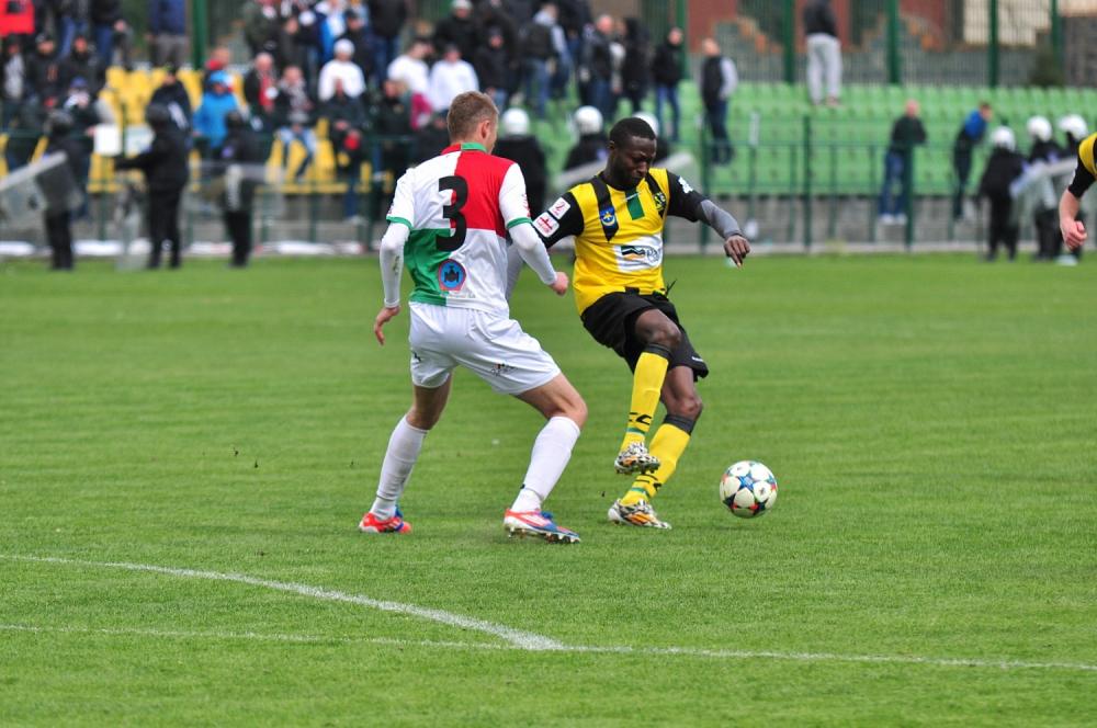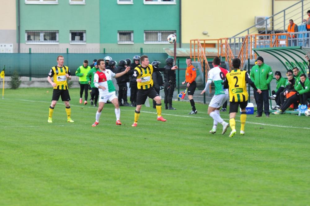 - Siarka Tarnobrzeg (żółto-czarne stroje) przegrała z Zagłębiem Sosnowiec 1-2. Nie popisali się kibice gości, którzy zniszczyli ogrodzenie i spalili flagę Siarki (fot. Grzegorz Lipiec)
