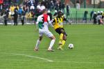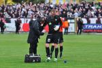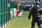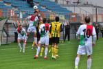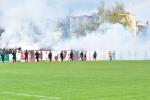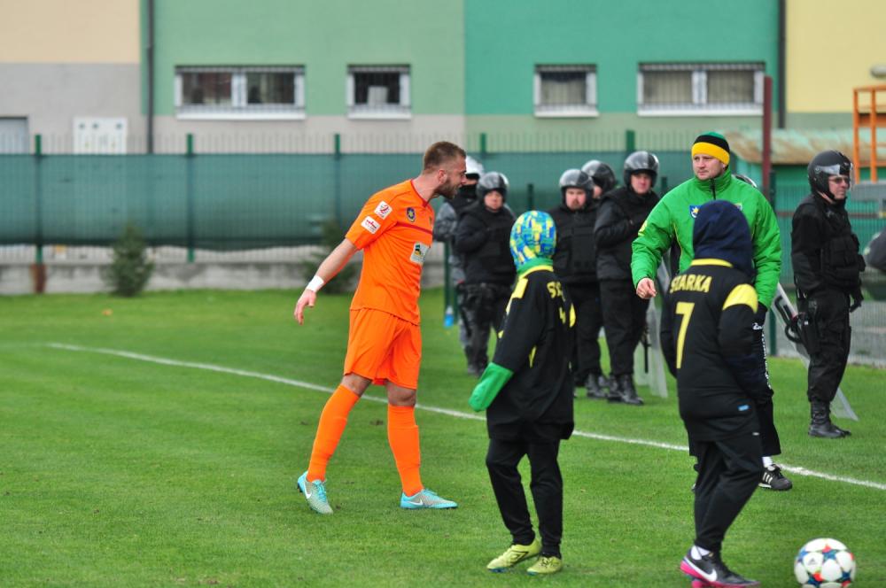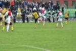 - Siarka Tarnobrzeg (żółto-czarne stroje) przegrała z Zagłębiem Sosnowiec 1-2. Nie popisali się kibice gości, którzy zniszczyli ogrodzenie i spalili flagę Siarki (fot. Grzegorz Lipiec)