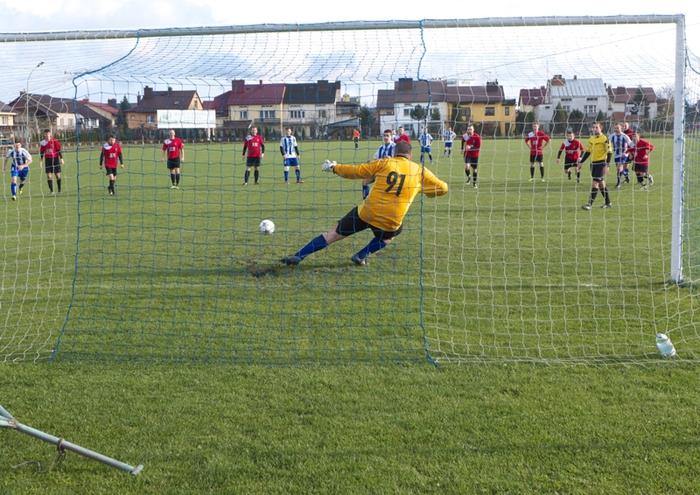 MKS Kańczuga pokonała Błękitnych Grzęska 2-0. Na zdjęciu gol Igora Ostruvki z rzutu karnego.