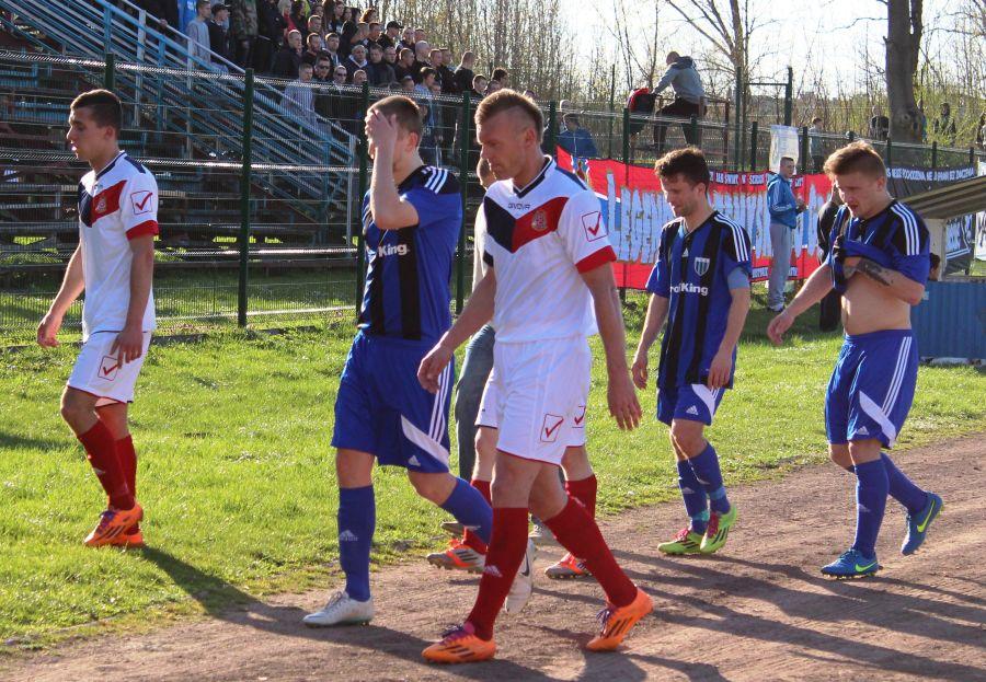 - Polonia Przemyśl (biało-czerwone stroje) wygrała 1-0 z grającym o ligę wyżej JKS-em Jarosław w pierwszym meczu finałowym okręgowego Pucharu Polski na szczeblu okręgu jarosławskiego. Rewanż 6 maja w Jarosławiu (fot. Jakub Kwiecień)