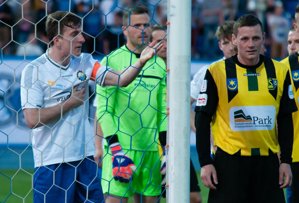 - Stal Mielec (biało-niebieskie stroje) pokonała Siarkę Tarnobrzeg 2-1 w piłkarskich derbach Podkarpacia (fot. Grześko)
