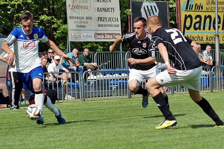 - Piast Tuczempy (czarno-białe stroje) wygrał ze Stalą Nowa Dęba 1-0 w meczu 23. kolejki 4 ligi podkarpackiej (fot. Mieczysław Turczyn)