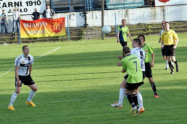 - LKS Skołoszów (zielono-granatowe koszulki) wygrali na wyjeździe z Czarnymi Jasło w meczu 4 ligi podkarpackiej. Obydwa gole dla gości zdobył Mateusz Buczkowski (fot. Mieczysław Turczyn)