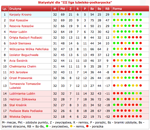 Na dwie kolejki przed końcem sezonu 2014/2015, Sokół Sieniawa zajmuje szóste miejsce w tabeli 3 ligi lubelsko-podkarpackiej.