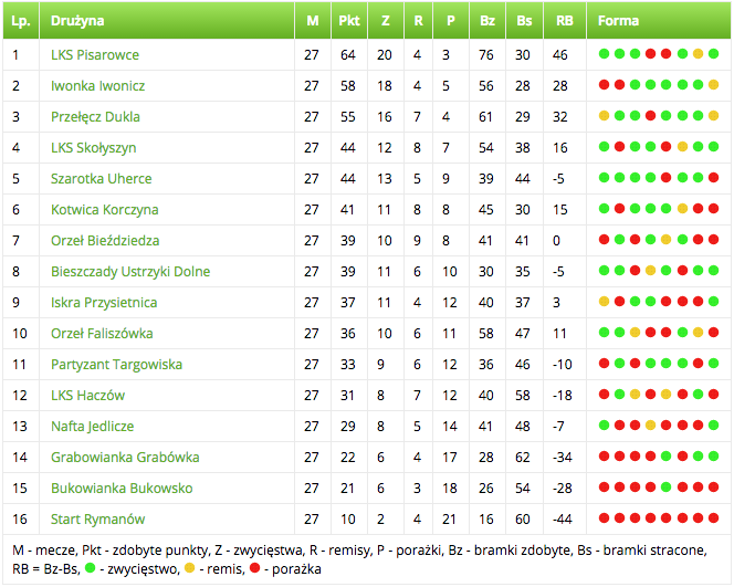 Tylko iluzoryczne szanse na promocję do 4 ligi podkarpackiej ma trzecia w tabeli Przełęcz Dukla, która nie dość, że musi liczyć na potknięcia rywali to w meczu 29. kolejki w Pisarowcach (21 czerwca) musiałaby wygrać co najmniej trzema bramkami.