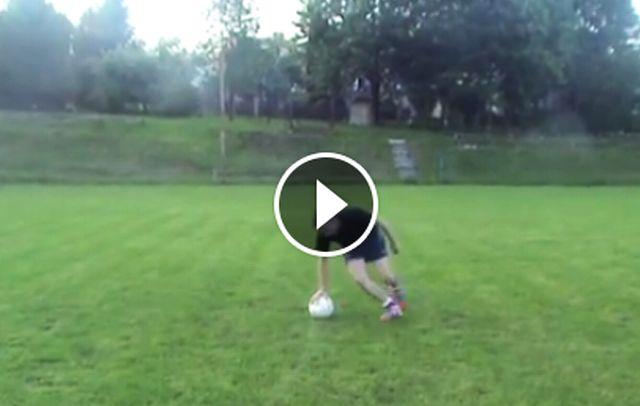 Tej drugiej dotykacie ręką i nieodrywając od niej ręki wykonujecie 13 obrotów wokół jej osi. Później biegniecie do piłki ustawionej na linii 11 metrów i próbujecie trafić do bramki :-)