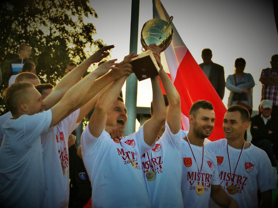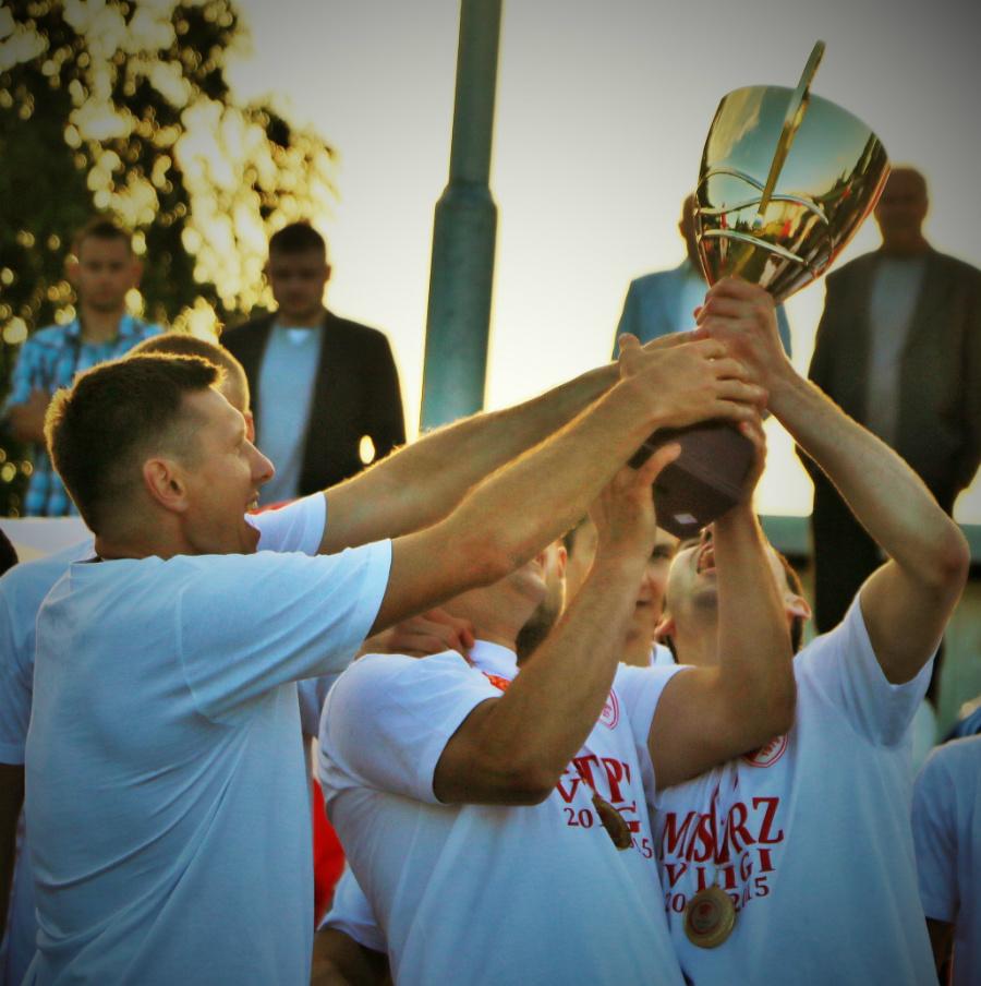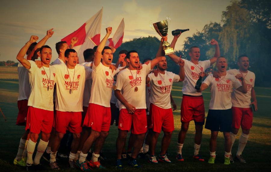 - KS Wiązownica (biało-czerwone stroje) zwycięstwem 1-0 z MKS-em Kańczuga przypieczętował wygraną w klasie O Jarosław w sezonie 2014/2015. Po meczu piłkarze, działacze i kibice świętowali historyczny awans do 4 ligi podkarpackiej (fot. Natalia Styś)