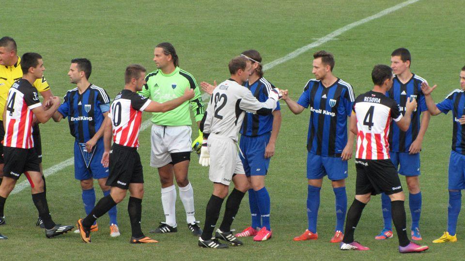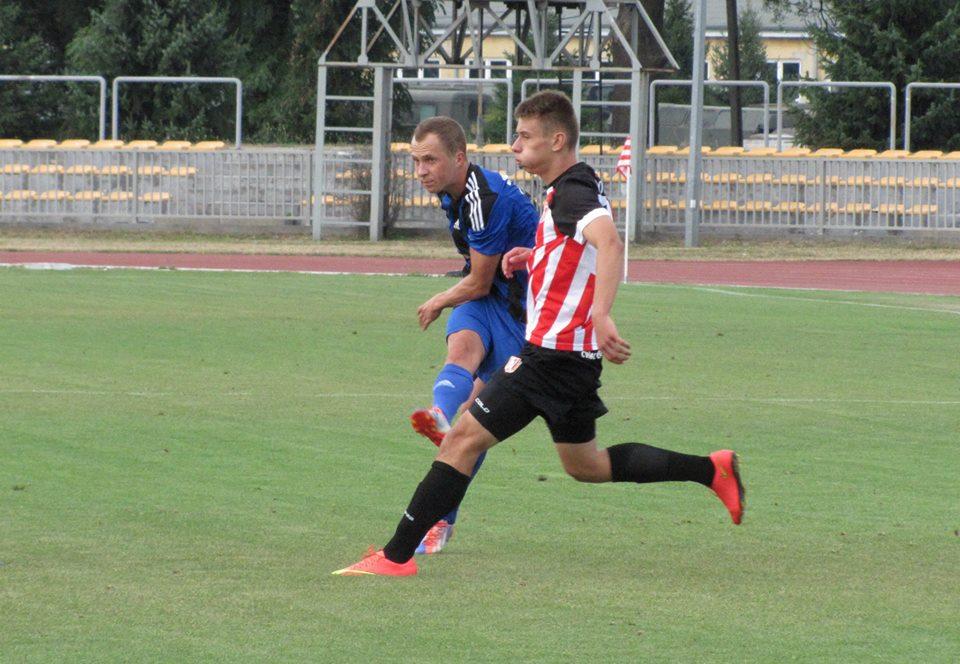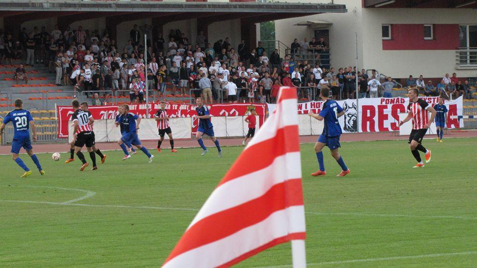 - Resovia (biało-czerwone pasiaki) pokonała JKS Jarosław 1-0. Jedynego gola zdobył w końcówce Mateusz Jurczak (fot. Klub 100 - JKS Jarosław)