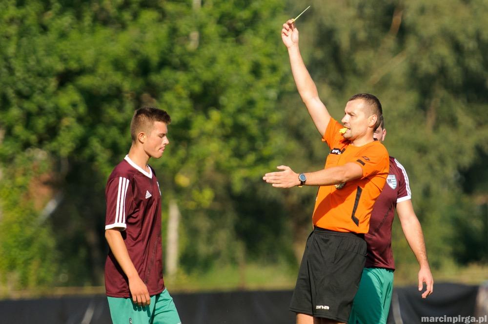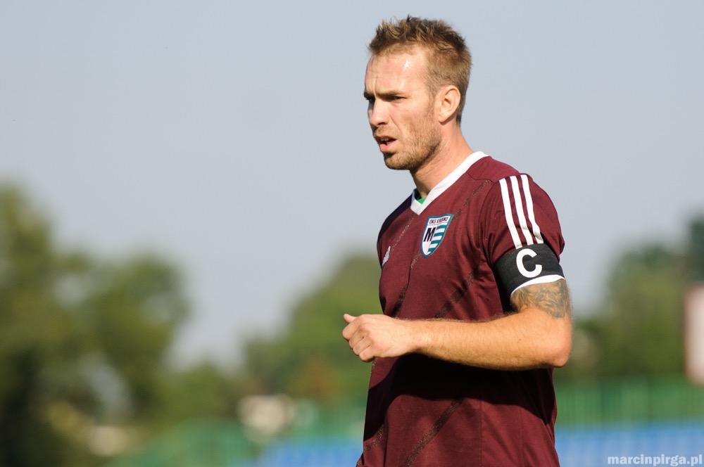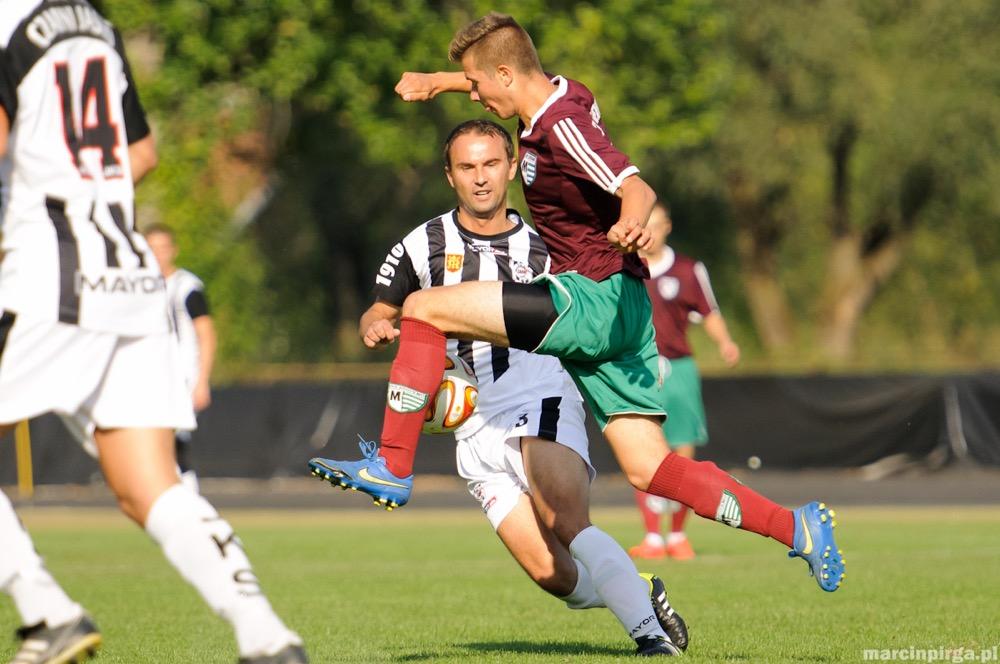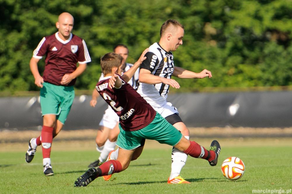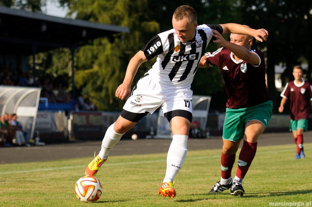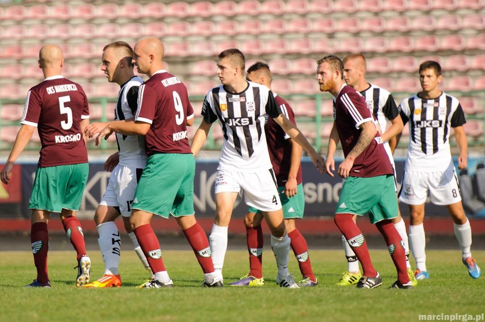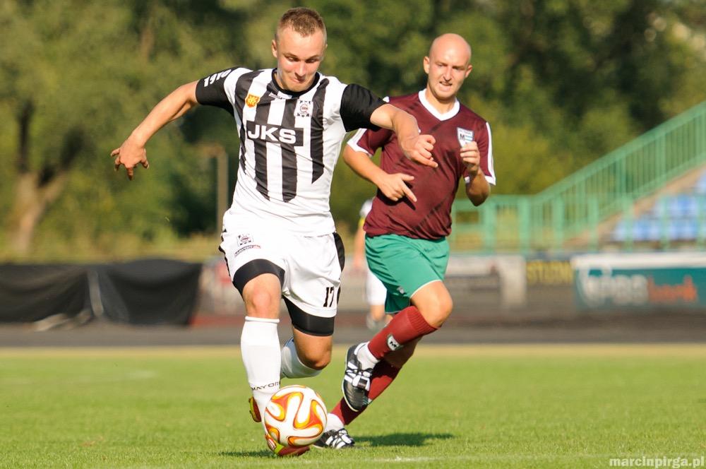 - Piłkarze Czarnych Jasło (biało-czarne stroje) wygrali w Krośnie z OKS-em Markiewicza aż 8-1. Cztery bramki zdobył Kamil Folwarski (fot. Marcin Pirga)