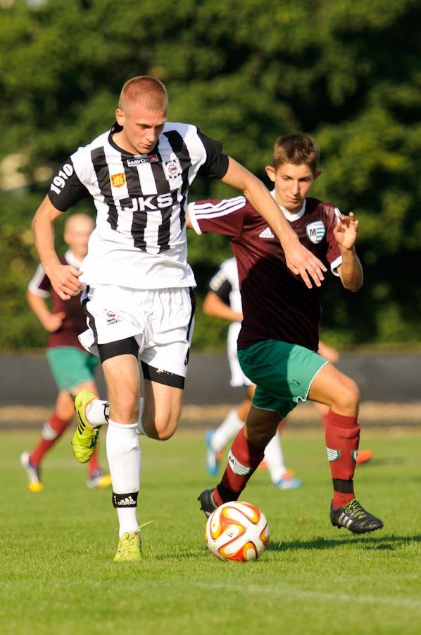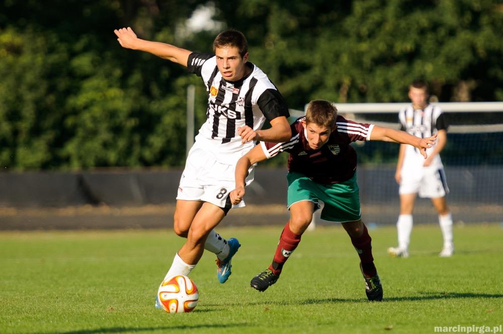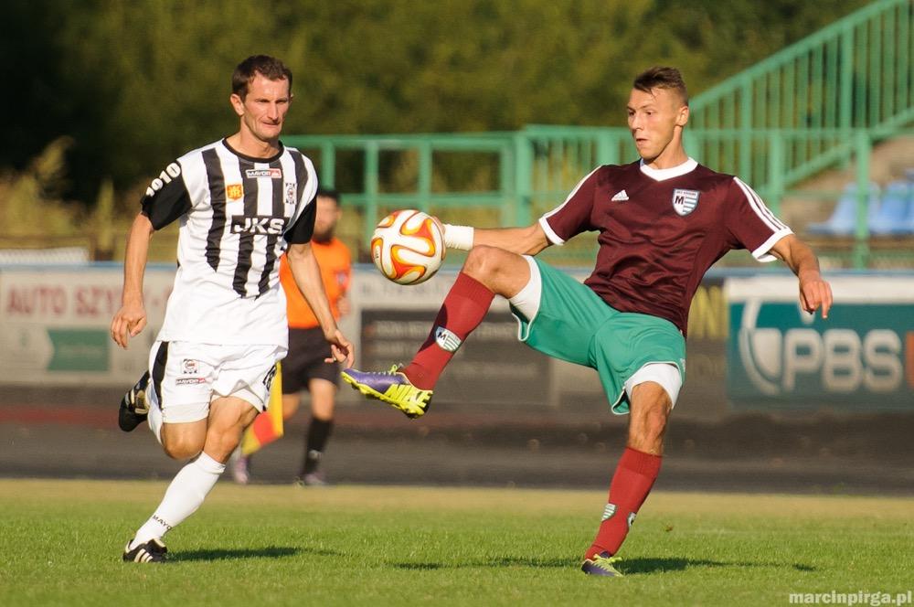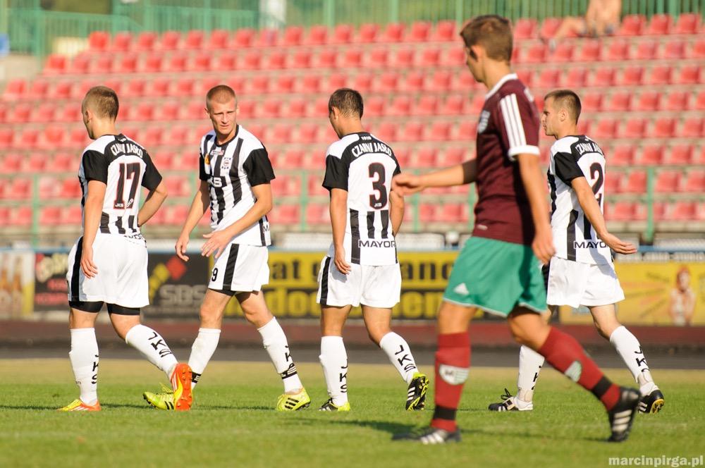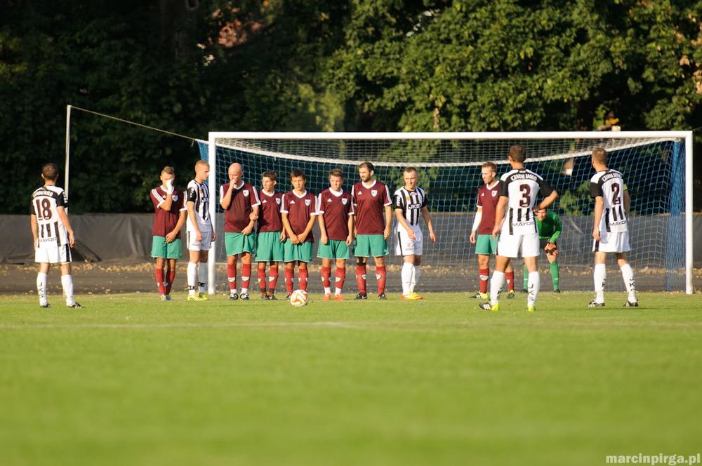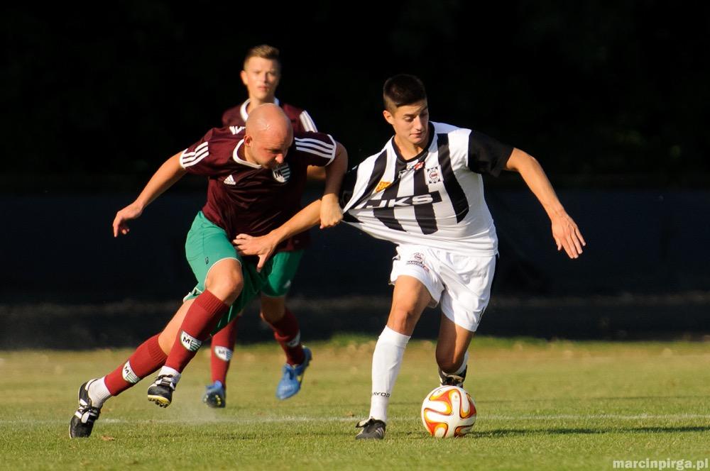 - Piłkarze Czarnych Jasło (biało-czarne stroje) wygrali w Krośnie z OKS-em Markiewicza aż 8-1. Cztery bramki zdobył Kamil Folwarski (fot. Marcin Pirga)