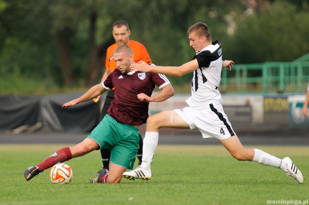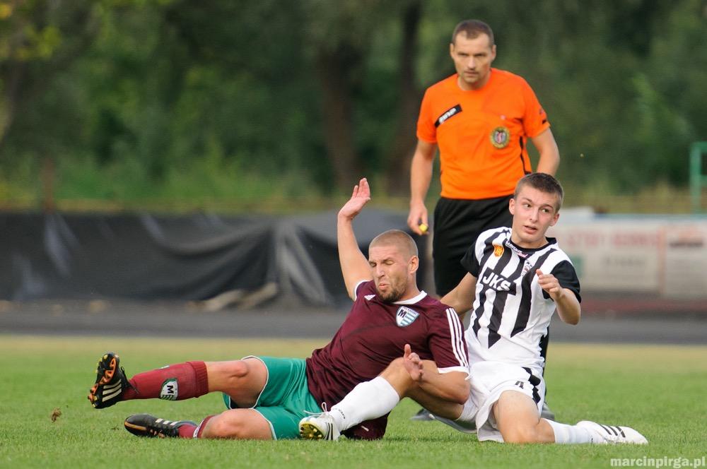 - Piłkarze Czarnych Jasło (biało-czarne stroje) wygrali w Krośnie z OKS-em Markiewicza aż 8-1. Cztery bramki zdobył Kamil Folwarski (fot. Marcin Pirga)