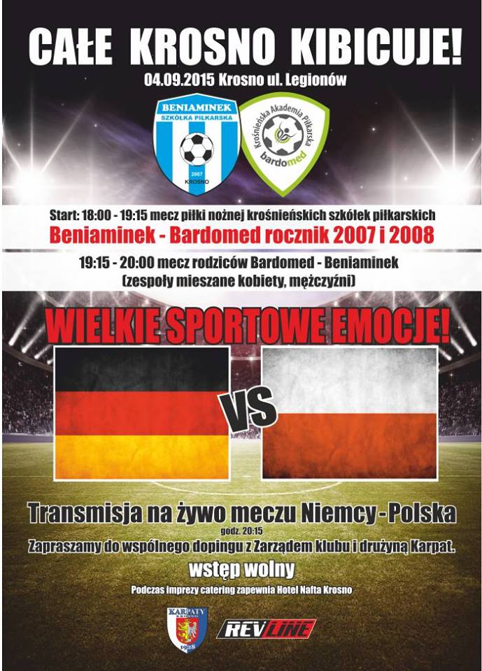 Mecz Niemcy - Polska rozpocznie się o godz. 20.45, ale impreza na stadionie Karpat Krosno startuje już o godz. 18. Właśnie wtedy w meczu piłkarskim zmierzą się reprezentacje dwóch krośnieńskich szkółe piłkarskich - Beniaminka i KAP Bardomed. Chwilę później zmierzą się rownież rodzice dzieci uczęszczających do tych szkółek.