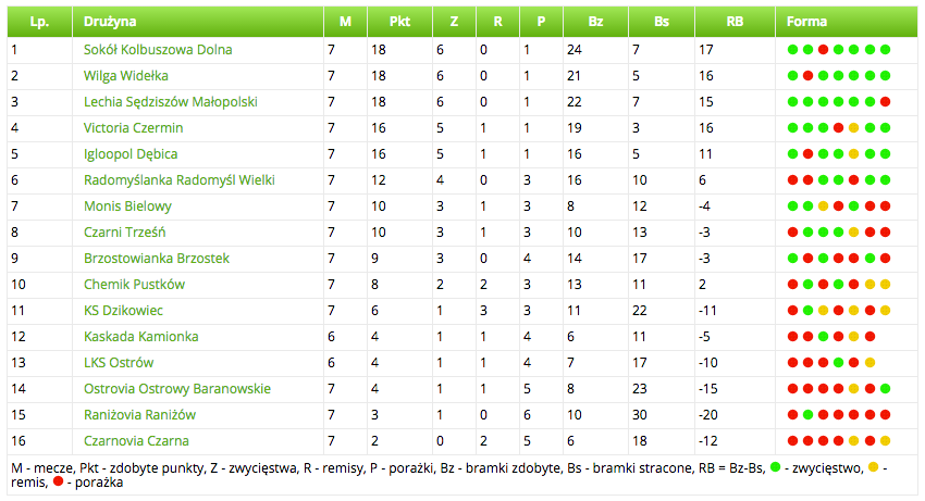 Piłkarze Lechii Sędziszów wyraźnie zaznaczają, że chcą liczyć się w walce o awans. Wygrali szósty mecz z rzędu tym razem pokonując Radomyślankę Radomyśl Wielki. Liderem pozostaje Sokół Kolbuszowa Dolna, który nie bez problemów pokonał na własnym boisku przeciwnika z Pustkowa.