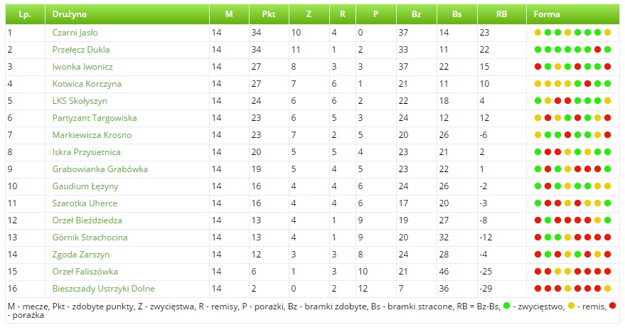 Czarni Jasło to nadal jedyna niepokonana drużyna w klasie O Krosno. W 14. kolejce lider zremisował z Kotwicą Korczyna 1-1.