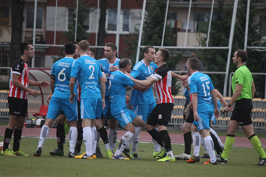 W meczu Resovii z Karpatami Krosno było sporo emocji. Arbiter pokazał łącznie aż 9 żółtych i jedną czerwoną kartkę.